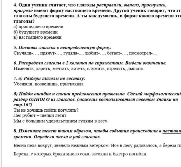 Ответ 4. а, прошедшее время; 5. скучали-скучать, прячут-прятать, гуляла-гулять, любит-любить, бегает-бегать, посмотрел-смотреть; 6. 1 спряжение-хотЕТЬ. 2 спряжение-изменЯТЬ, дарИТЬ, мечтАТЬ, служИТЬ, стрелЯТЬ, дышАТЬ; 7. А. УБЕЖАЛИ - приставка-У, корень- БЕЖ, суффикс-А,Л, окончание-И, основа-УБЕЖАЛ; ПОЗВОНИШЬ- приставка-ПО, корень-ЗВОН, окончание-ИШЬ, основа-ПОЗВОН; ПРИСКАКАЛА- приставка-ПРИ, корень-СКАК, суффиксы-А,Л, окончание-А, основа-ПРИСКАКА; Б. Ты не хочЕшь пойти погулять? Лес рубЯт-щепки летят. Мы с большим удовольствием гуляем в лесу. РУБЯТ-глагол, начальная форма-рубить, постоянные признаки-2 спряжение, несовершенный вид, непостоянные признаки-множественное число, настоящее время, 3-е лицо, изъявительное наклонение. 8. Весна поёт-(единственное число, женский род) вокруг, звенит-(ед.ч, ж.р) нежным ветерком. Все в лесу радуются-( множественное число, род указать невозможно), а берёза плачет-(ед.ч, ж.р). Берёзы, с которых берут-(мн.ч, род указать невозможно) много сока, засыхают-(мн.ч) и быстро погибают-(мн.ч). ЖЕЛАЮ УДАЧИ)))