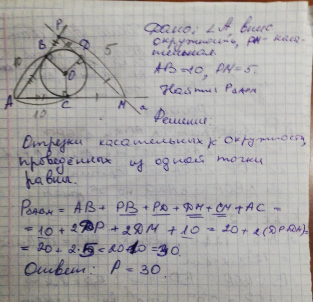 у даний кут а вписано коло що дотикається сторін кута в точках B i C у довільній взятій точці D кола проведено дотичну визначити периметр трикутника утвореного дотичною і сторонами кута, якщо довжина відрізка дотичної який розташований усередині кута дорівнює 5 а довжина відрізка AB 10