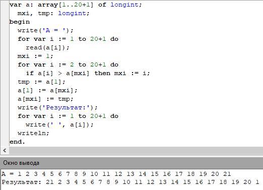 дано А[1...20+і] (і номер варіанту). Перший додатний елемент поміняти місцями з максимальним (Паскаль)