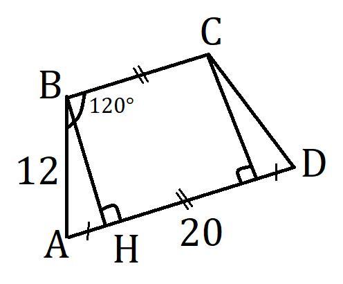найти площадь равносторонней трапеции если большая основа равна 20 а боковая сторона 12 а тупой угол 120 градусов