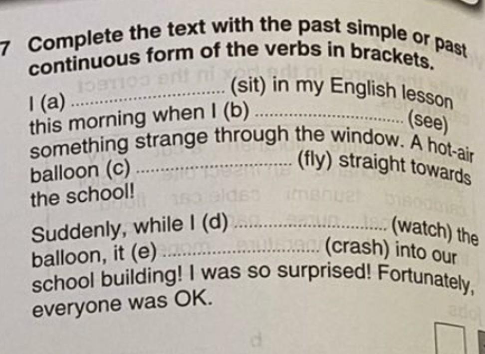 I a) was sitting in my English lesson this morning when I b) saw something strange through the window. A hot-air balloon c) was flying straight towards the school!