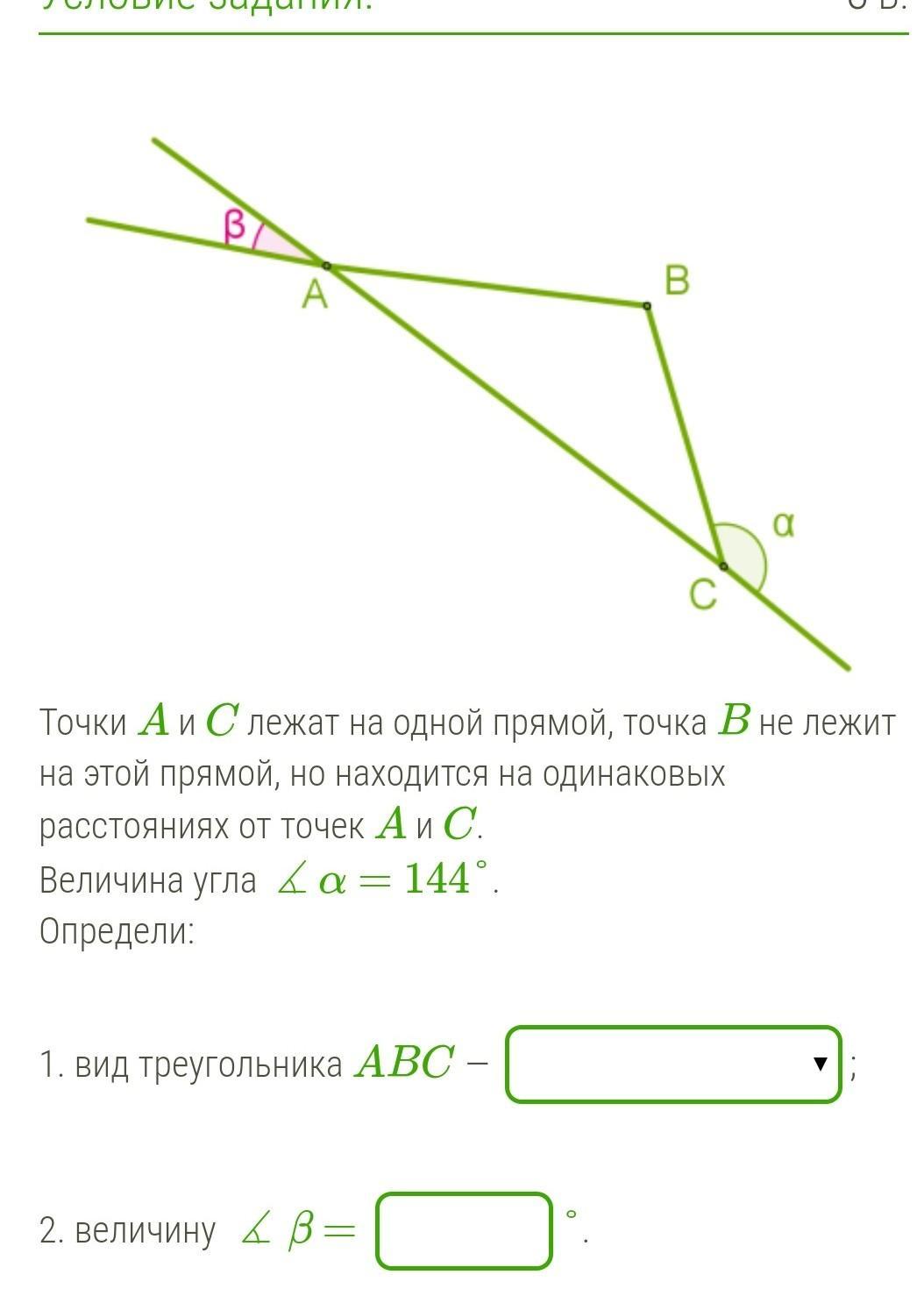 β = ∠BAC как вертикальные углы (образованы пересечением прямых AB и AC). β = ∠BAC = ∠BCA = 36°.
