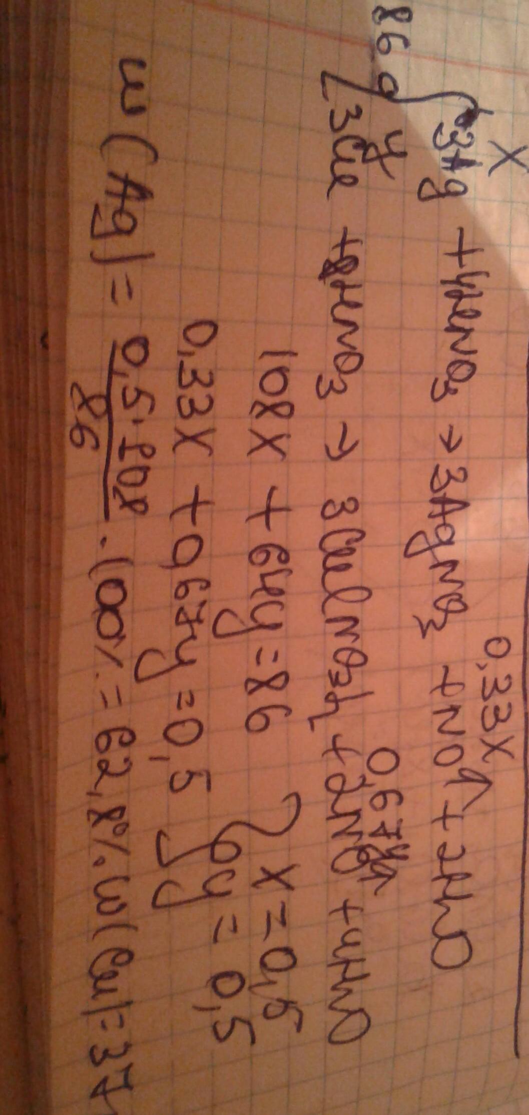На 86 г сплава серебра с медью подействовали избытком разбавленной азотной кислоты. Объем выделившегося газа равен 11,2 л. Определите массовую долю (%) металлов в сплаве.