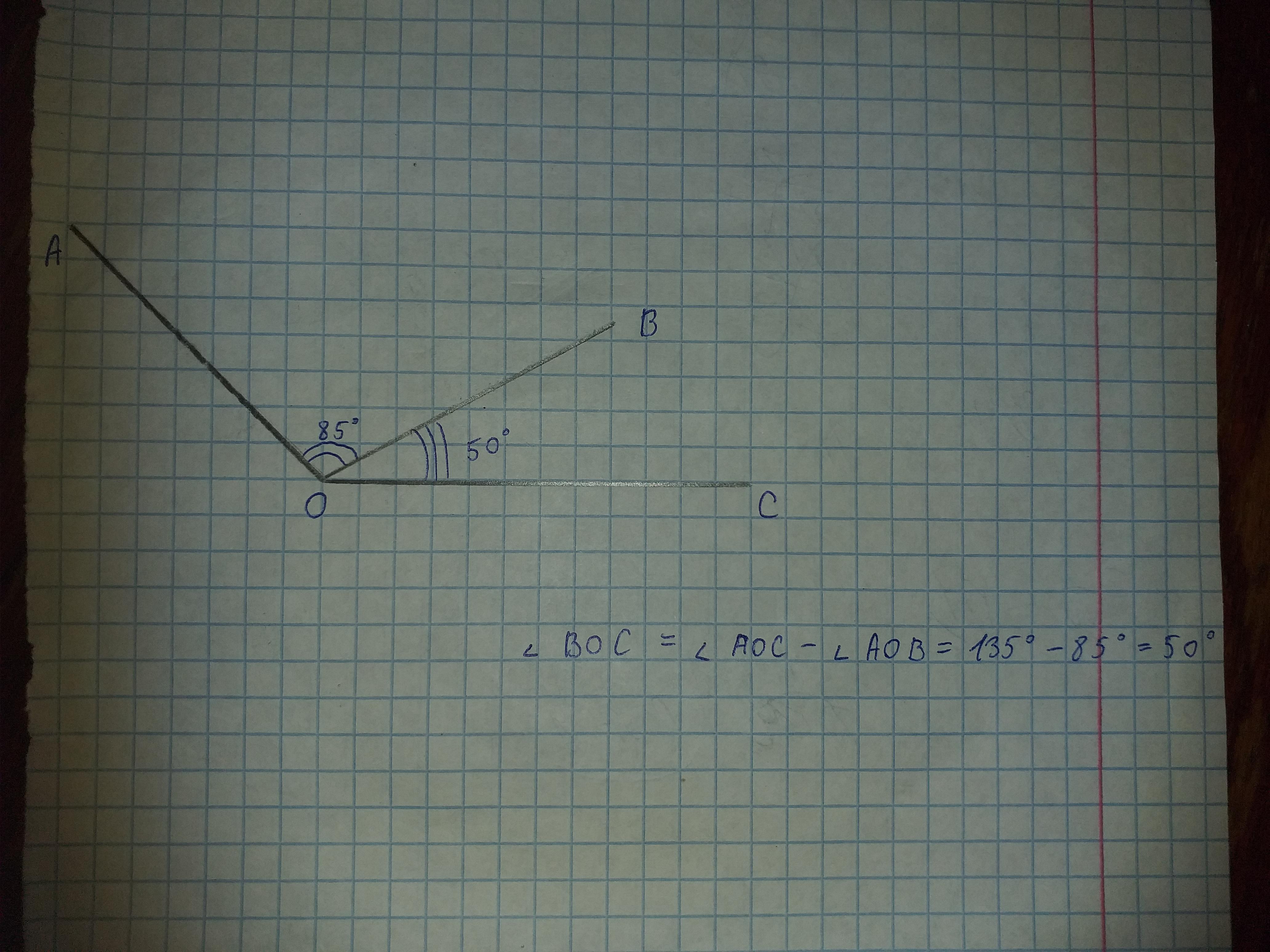 Начертите угол АОС, равный 1350. Лучом ОВ разделите этот угол так, чтобы получившийся угол АОВ был равен 850. Вычислите градусную меру угла ВОС.