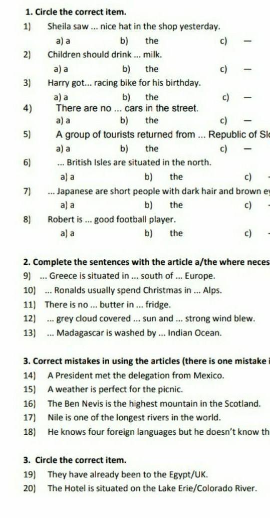 3. Correct mistakes in using the articles (there is one mistake in every sentence). 14) A President met the delegation from Mexico. 15) A weather is perfect for the picnic. 16) The Ben Nevis is the highest mountain in the Scotland. 17) Nile is one of the longest rivers in the world. 18) He knows four foreign languages but he doesn't know the Japanese.