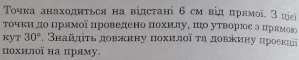Получился прямоугольный треугольник, у которого катет 6 см лежит против угла 30 градусов. Значит длина наклонной в 2 раза больше и равна 12 см. Проекция наклонной - это второй катет, обозначим х.