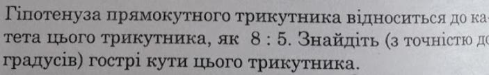 Переворачиваем 8/5, получаем 5/8 — это отношение катета к гипотенузе, т.е. синус, тогда острый угол напротив рассматриваемого катета определим как арксинус(5/8).