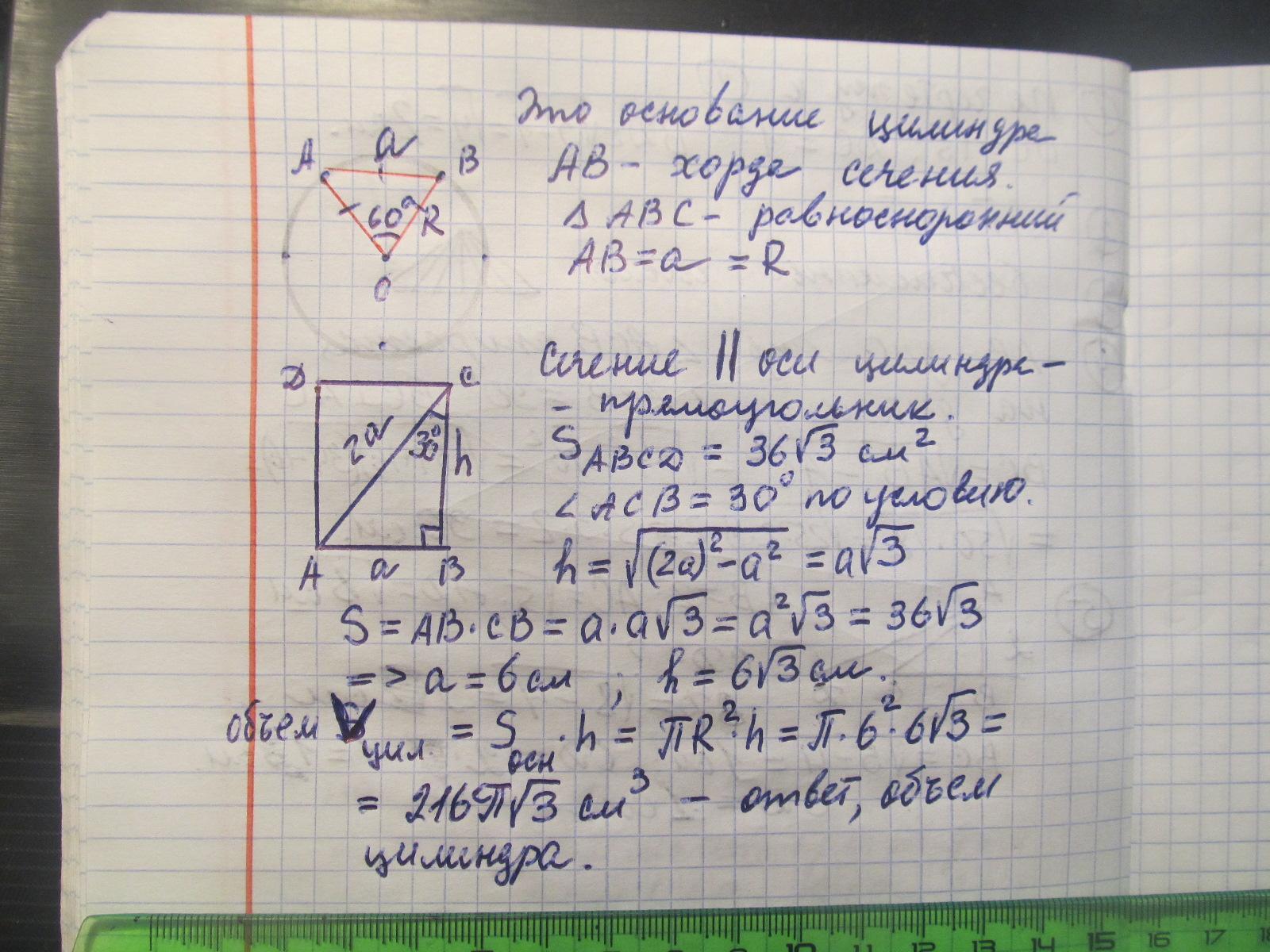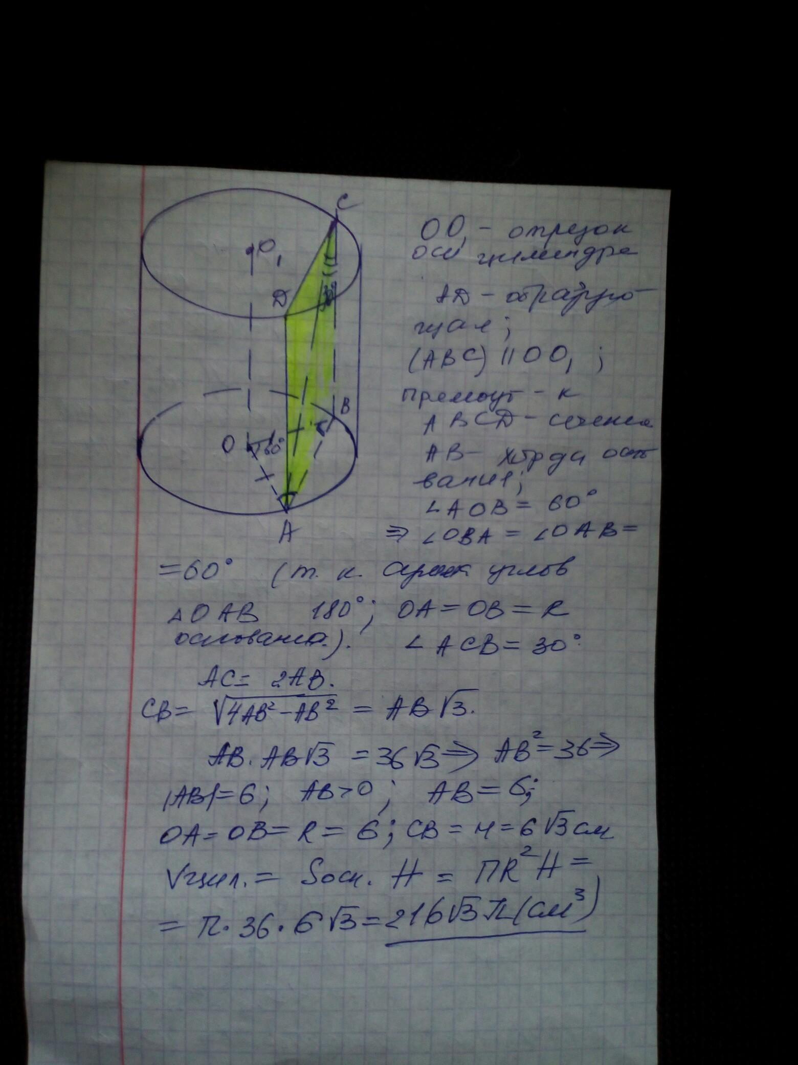 У циліндрі паралельно осі проведено переріз, що перетинає основу по хорді, яку видно із центра цієї основи під кутом 60°. Площа утвореного перерізу дорівнює 36√3 см², а діагональ перерізу утворює з висотою циліндра кут 30°. Знайдіть об'єм циліндра