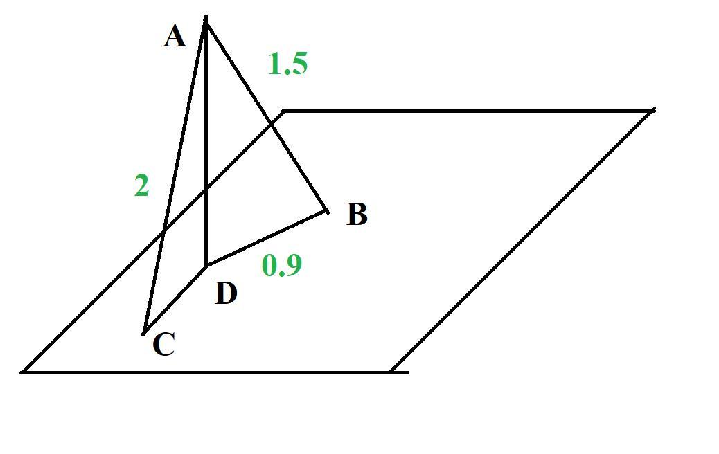 Из точки A к плоскости альфа проведены две наклонные AC и AB, и перпендикуляр AD. Найти CD, если AB= 1,5 дм; AC=2 дм; BD=0,9 дм.