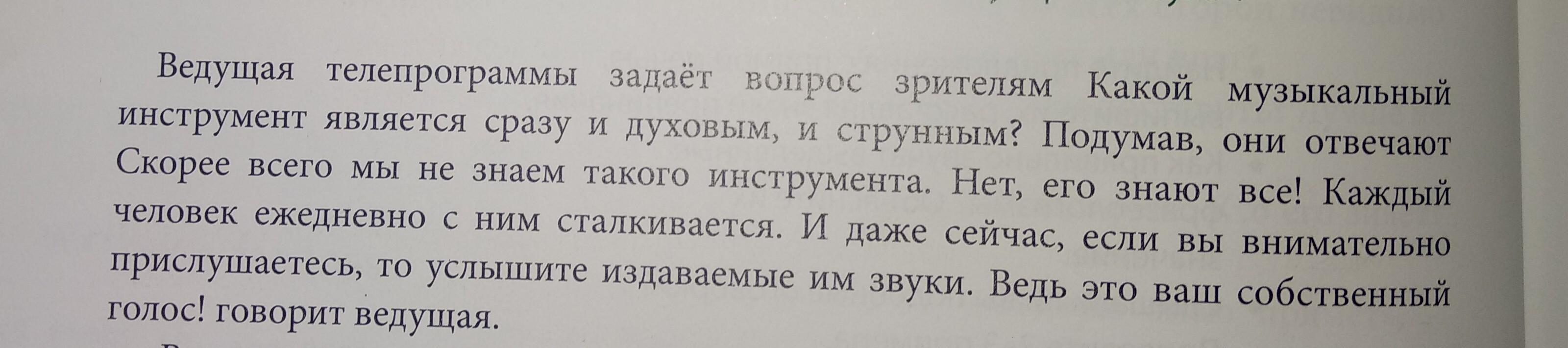 Ведущая телепрограммы задала слушателям вопрос о том, какой музыкальный инструмент является сразу и духовым, и струнным.
