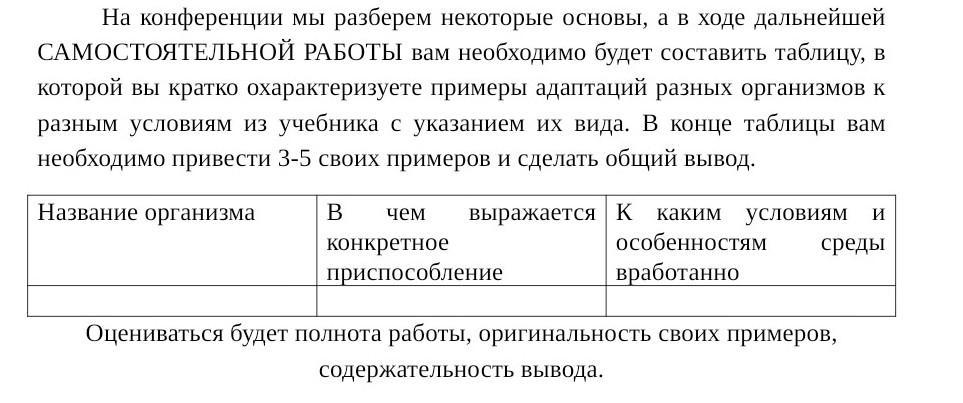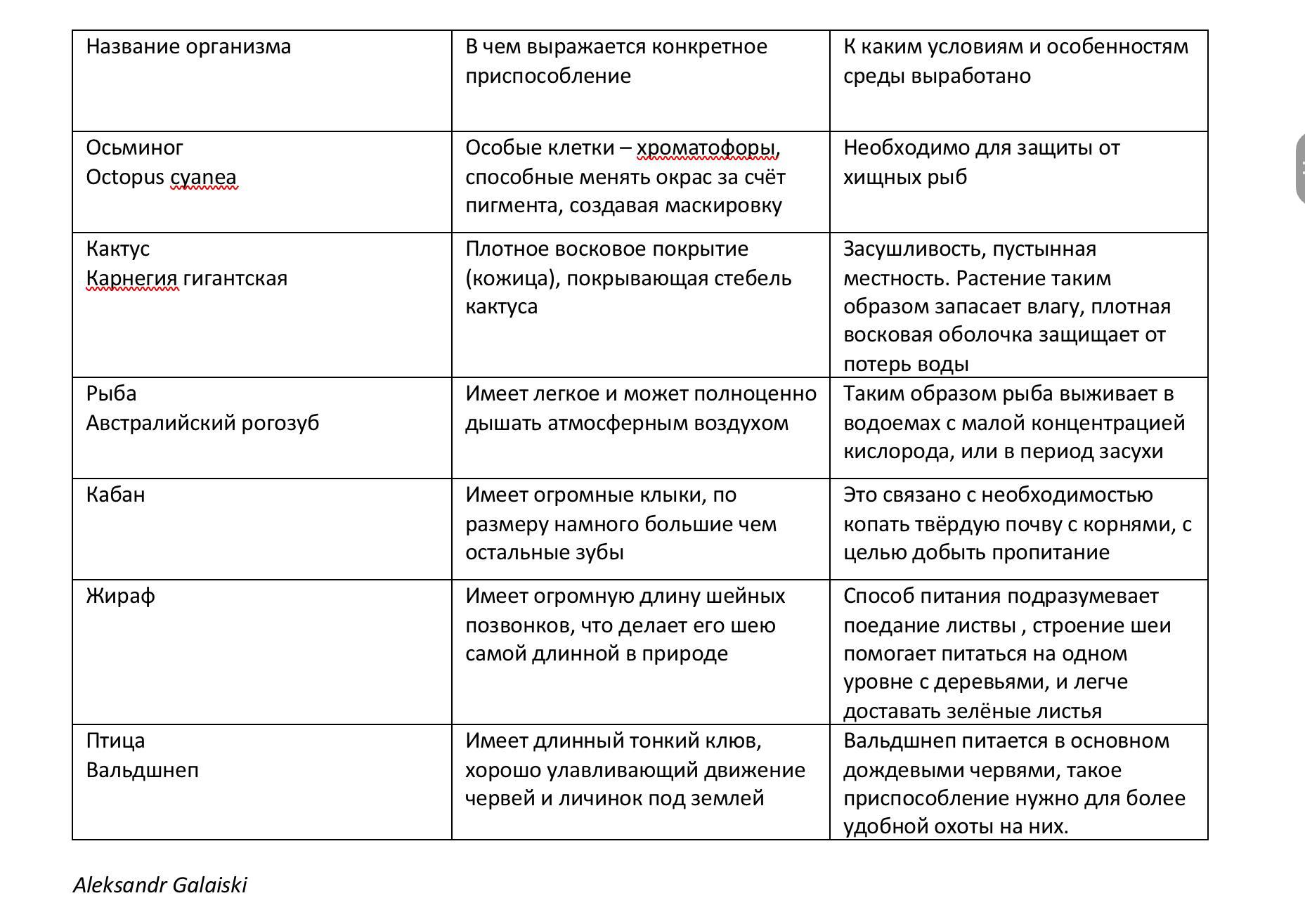 6 организмов, в каждом случае выделена одно приспособление к среде, все на изображении.