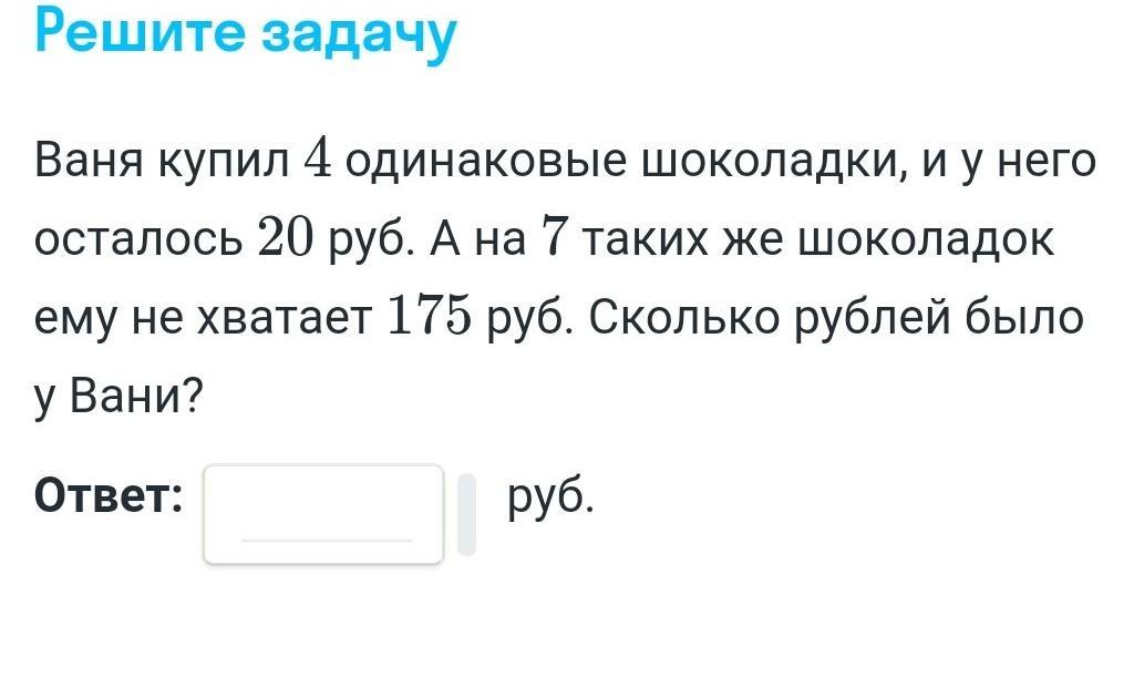 20+175=195 рублей (сумма оставшаяся и сумма недостающая)