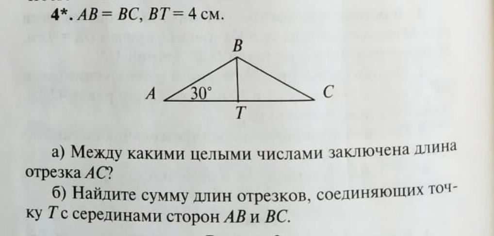 а)Так как АВ = ВС , то треугольник АВС - равнобедренный, ВТ - высота, значит медиана и биссектриса. (хотя в дано почему то не прописано, про ВТ) Треугольник АВТ - прямоугольный. Против угла 30 градусов лежит катет в 2 раза меньше гипотенузы, значит АВ=ВС = 4*2=8 см.