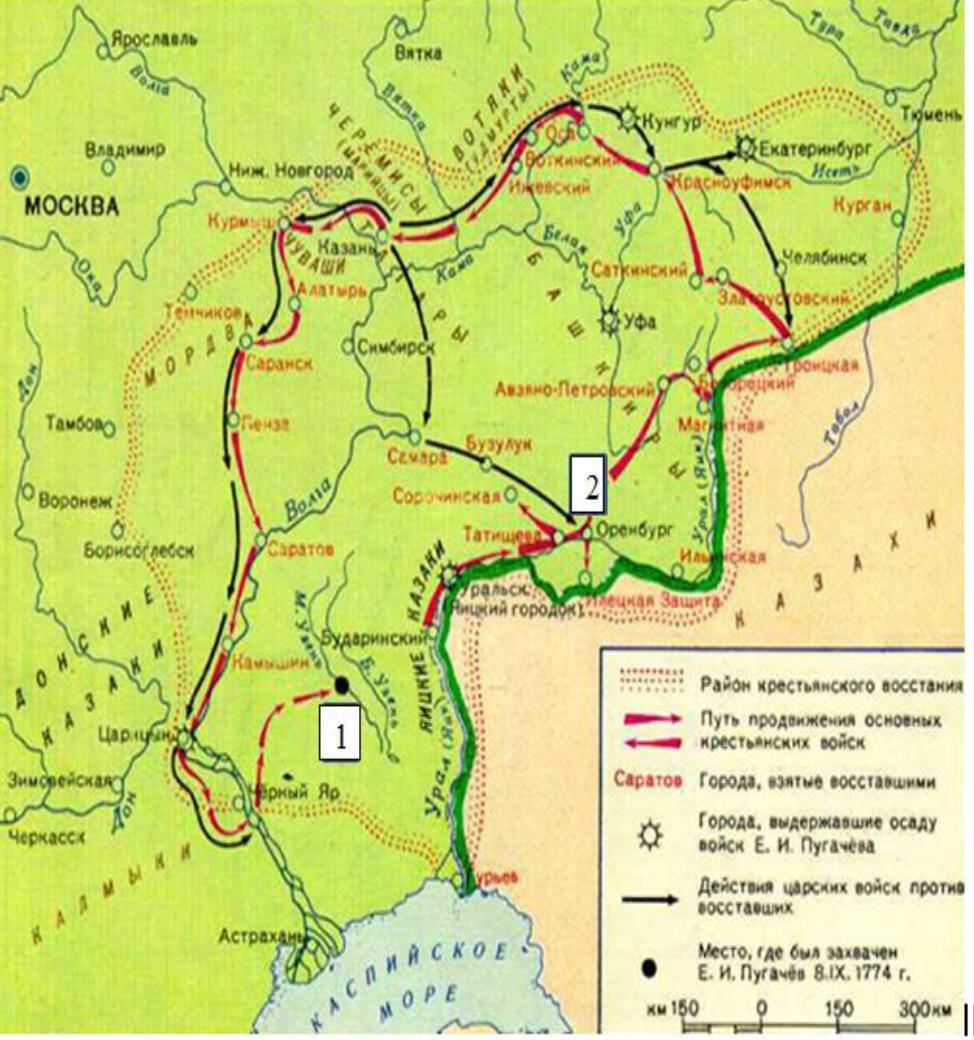 4) Цифрой «1» на карте обозначено место, где был захвачен Пугачев.