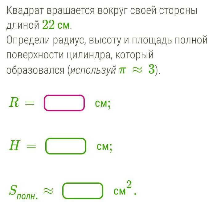 S полной поверхности цилиндра = S удвоенной площади основания (S осн) + S боковой поверхности цилиндра (S бок)