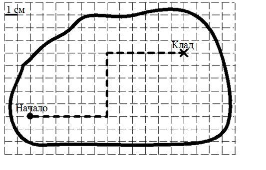 По рисунку определите длину маршрута (в км), который необходимо пройти персонажу книги «Ост-ров сокровищ» Билли Бонсу, если известно, что мас-штаб карты 1:10000 см.
