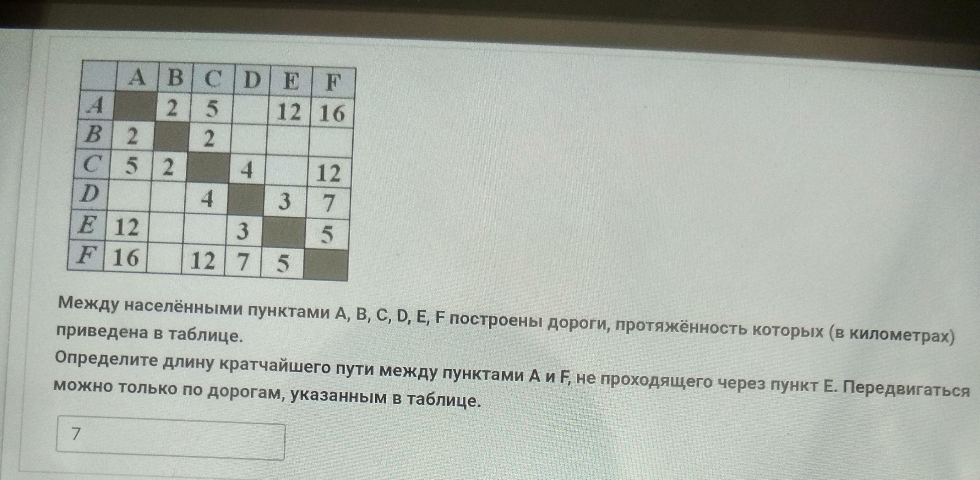 - A-B-C-D-F = 2+2+4+7 = 15 (кратчайший).