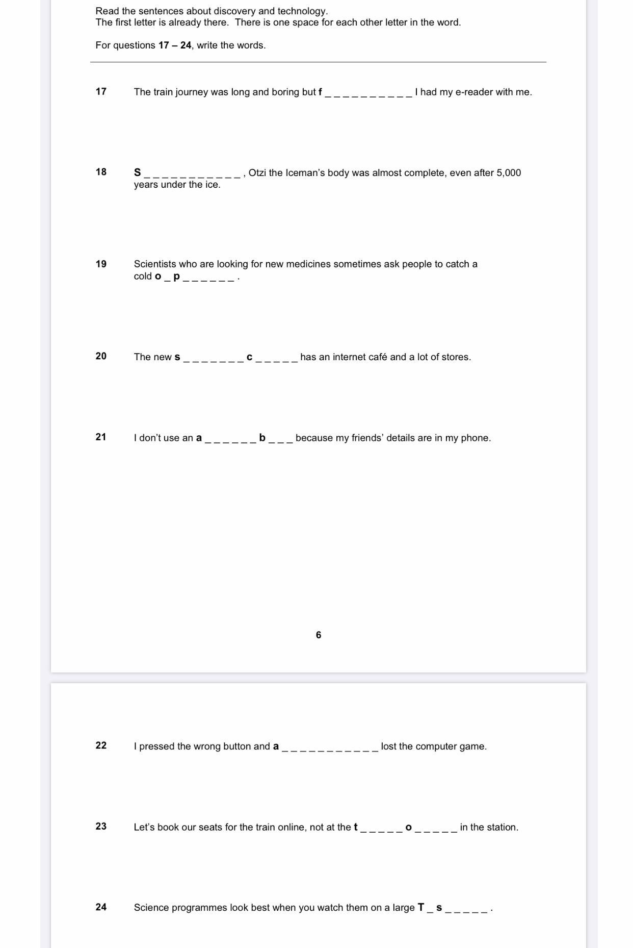 Read the sentences about discovery and technology. The first letter is already there. There is one space for each other letter in the word. For questions 17 - 24, write the words.