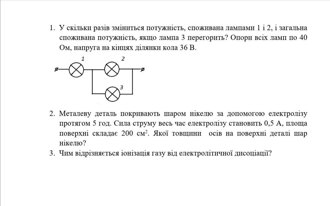 1) розкладемо задачу на 2 етапи, в першому лампочка не сгоріла і схема має 3 лампи. 2і 3 лампи включені паралельно, знайдемо їх спільний опір , так як вони одного номіналу по 40 Ом , то R сп.=40/2=20 ом , R1=40 тоді спільний опір для ділянки буде 40+20=60 ом., знайдемо струм і потужність :I=U/R=36/60=0.6a P=U*I=36*0.6=21.6 W