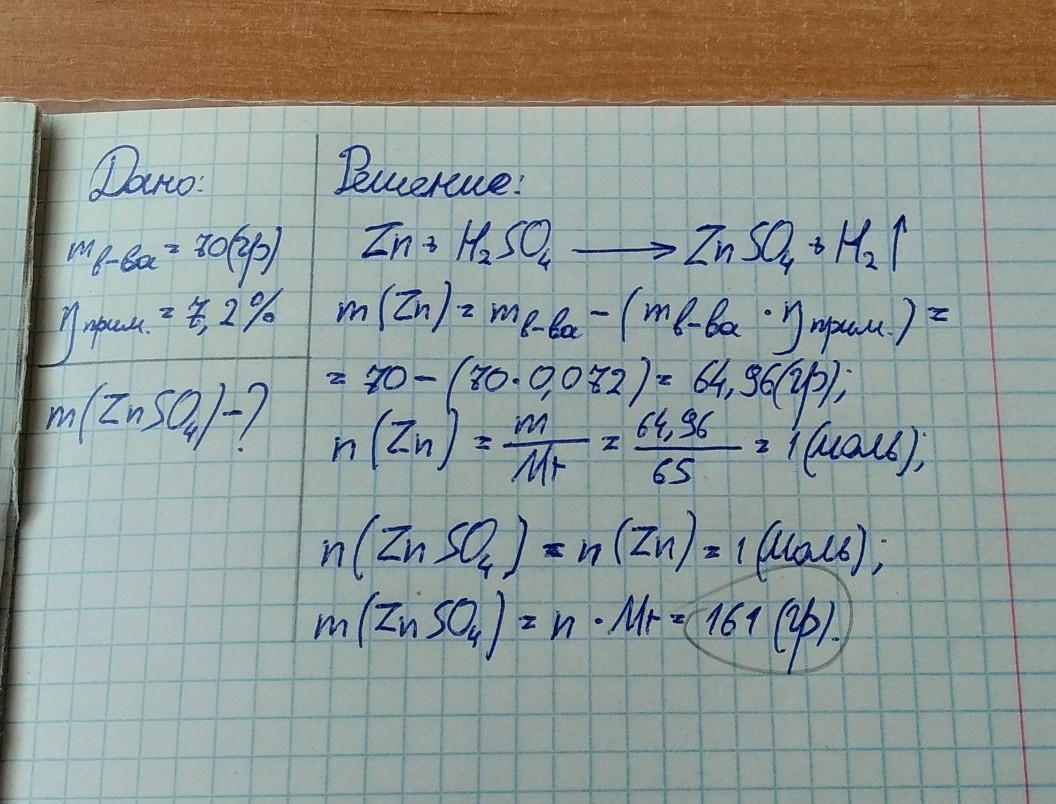 Сколько граммов сульфата цинка получится при растворении 70 г цинка,содержащего 7,2 % примесей ?