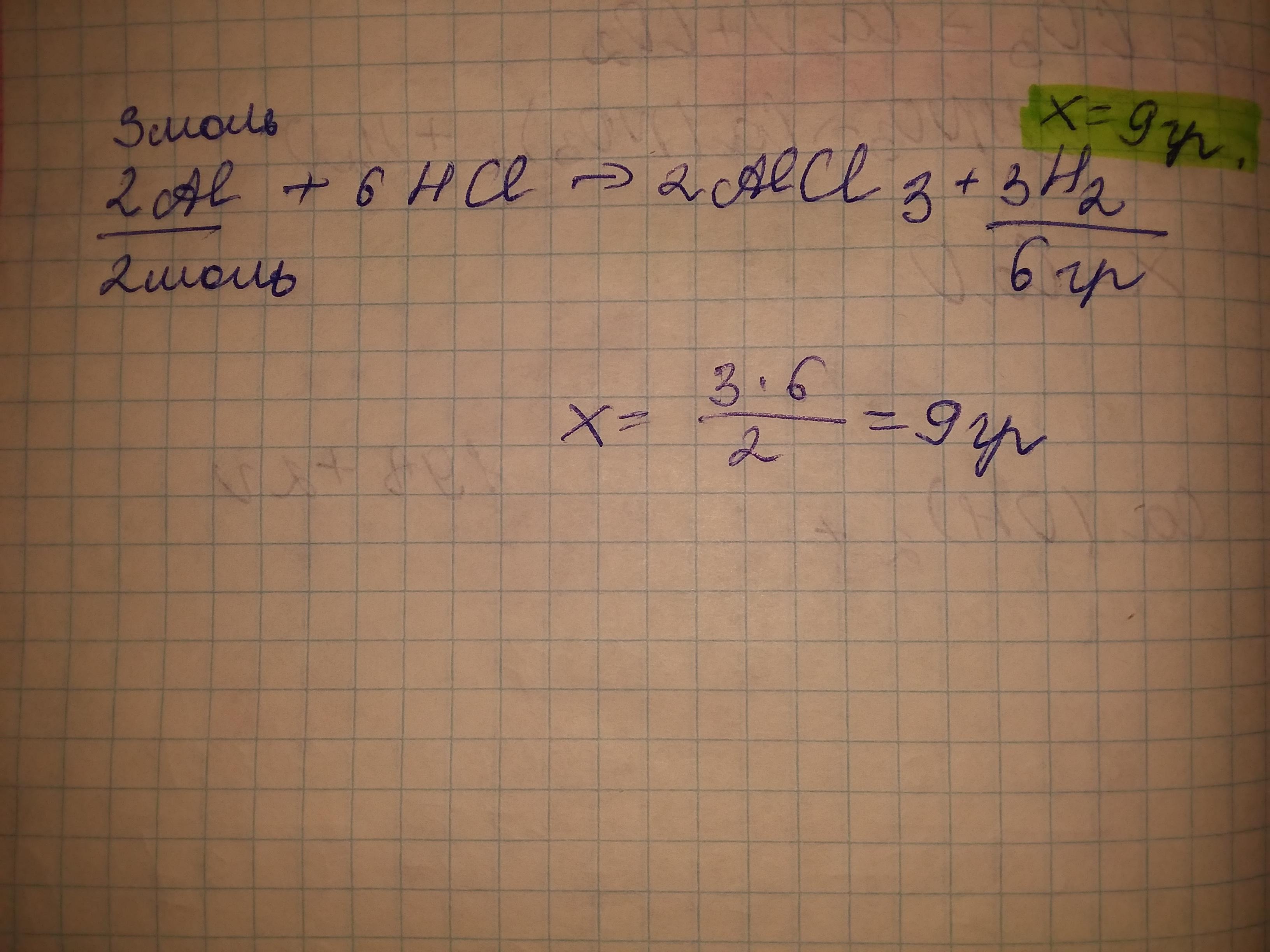 2. Вычислите массу водорода, который образуется при взаимодействии 3 моль алюминия с соляной кислотой: 2Al + 6HCl = 2AlCl³ + 3H²