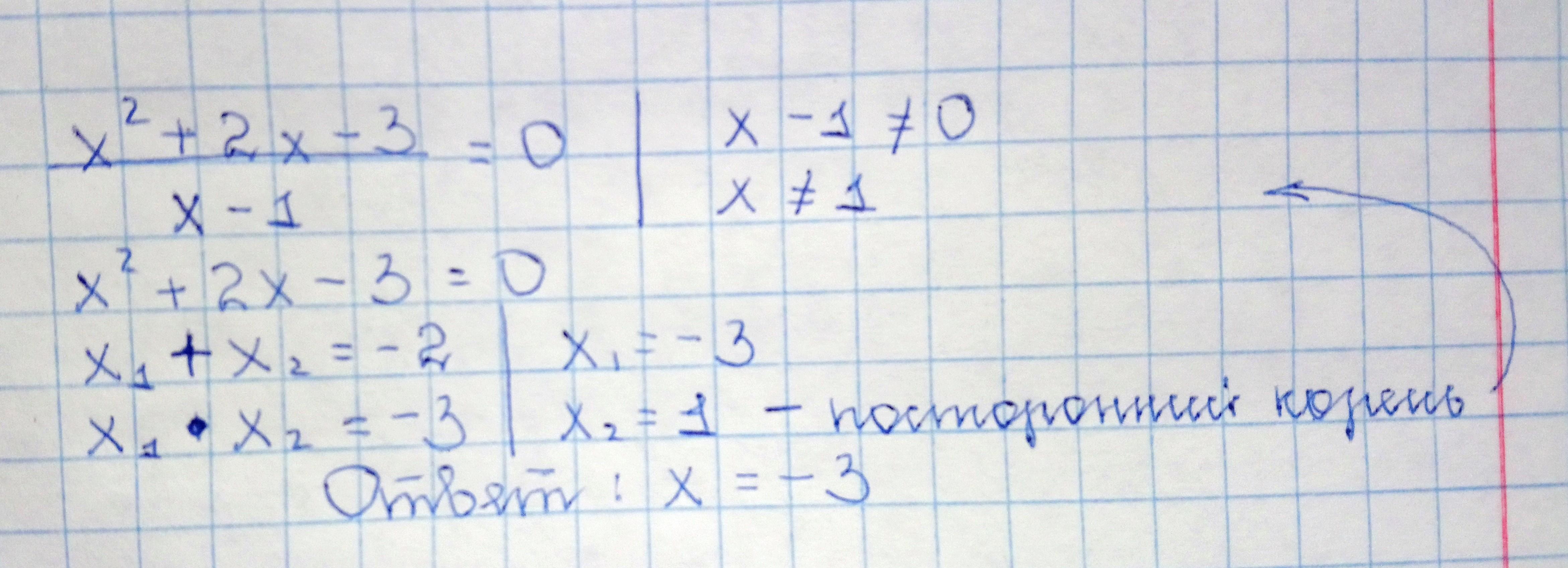 Когда уравнение приравнивается к нулю, знаменатель не должен обращаться в ноль (на 0 делить нельзя). Поэтому x не должен быть равен 1. Остаётся уравнение x^2+2x-3=0. По теорема Виета находим корни и смотрим, чтобы знаменатель не обращался в ноль.