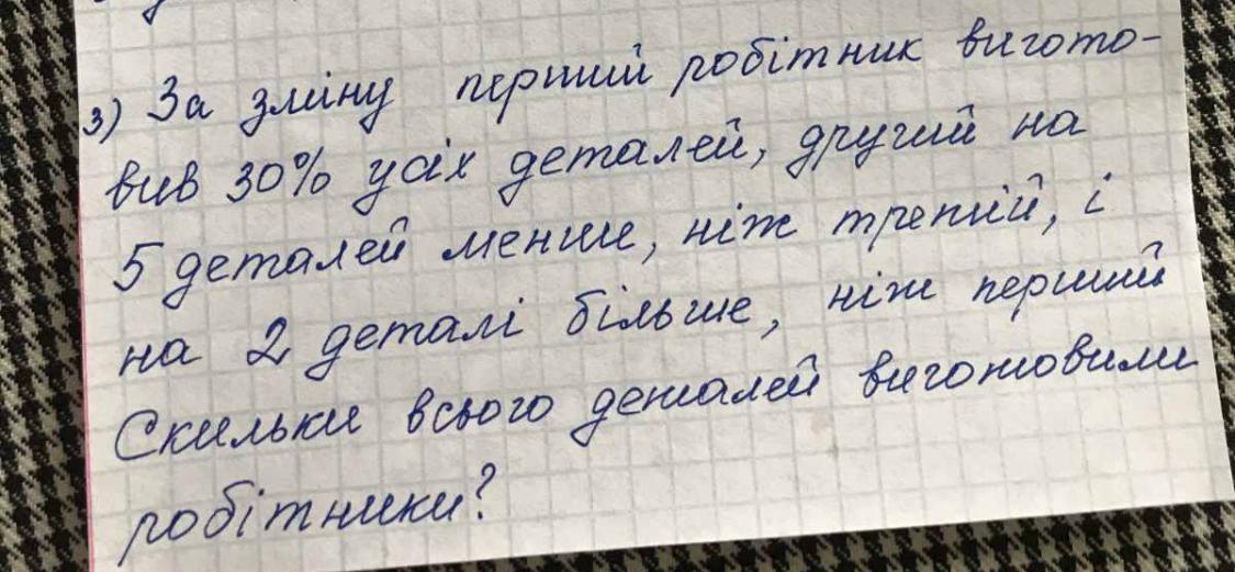 За зміну перший робітник виготовив 30% усіх деталей, другий на 5 деталей менше ніж третій, і на дві деталі більше ніж перший скільки всього деталей виготовили робітники?