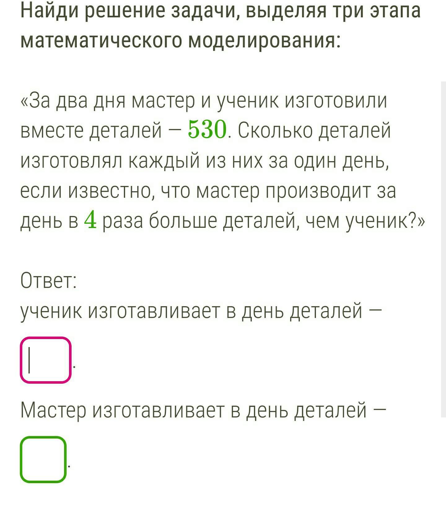 Учень робить в день Х деталей , майстер в 4 рази більше це буде 4х деталей, вони працюють 2 дні і зробили за 2 дні 530 деталей