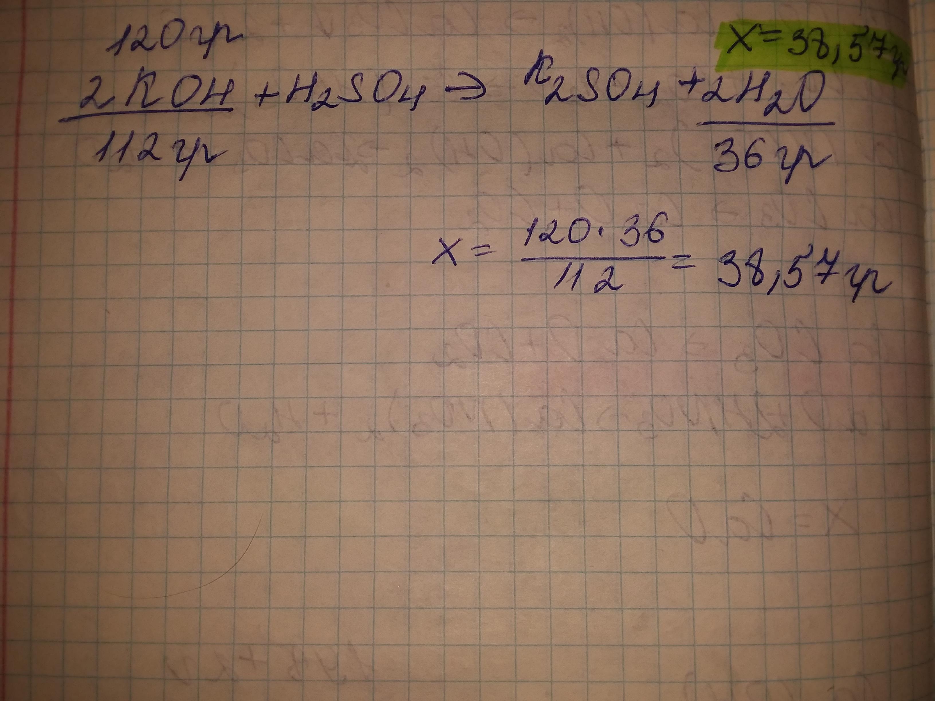 Вычислите массу воды, образовавшейся при взаимодействии 120 г гидроксида калия с серной кислотой