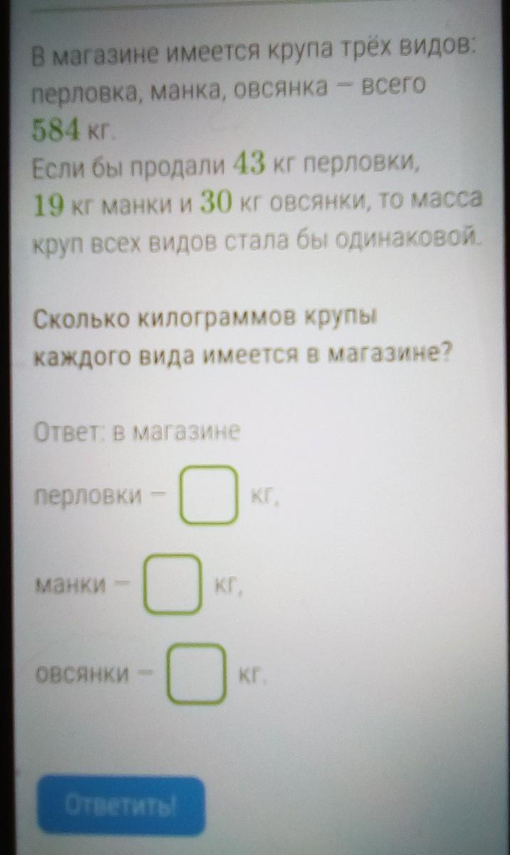 В магазине имеется крупа трёх видов перловка, манка, овсянка - всего 584 кг. Если бы продали 43 кг перловки, 19 кг манки и 30 кг овсянки, то масса круп всех видов стала бы одинаковой. Сколько килограммов крупы каждого вида имеется в магазине? Ответ: в магазине перловки - манки кг овсянки помогите пж срочно