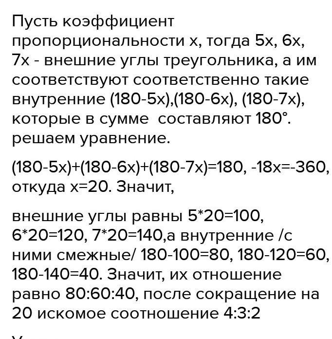 Зовнішні кути трикутника відносяться як 5; 6; 7; знайти внутрішні кути цього трикутника