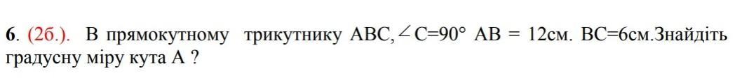 Гіпотенуза АВ=12 см, катет ВС=6 см, отже катет вдвічі менший за гіпотенузу, значить, він лежить навпроти кута 30 градусов.