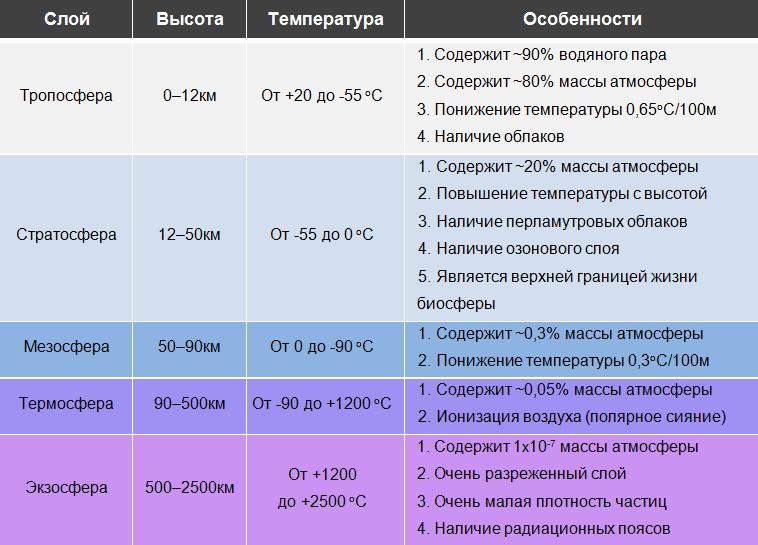 В таблице отображена краткая характеристика слоёв. Переходы между слоями не резкие, они (слои) плавно переходят друг в друга, поэтому обычно выделяют ещё и переходные: