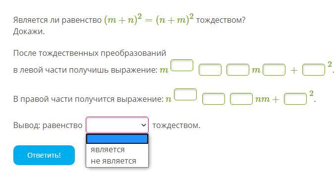 Является ли равенство (m+n)2=(n+m)2 тождеством?