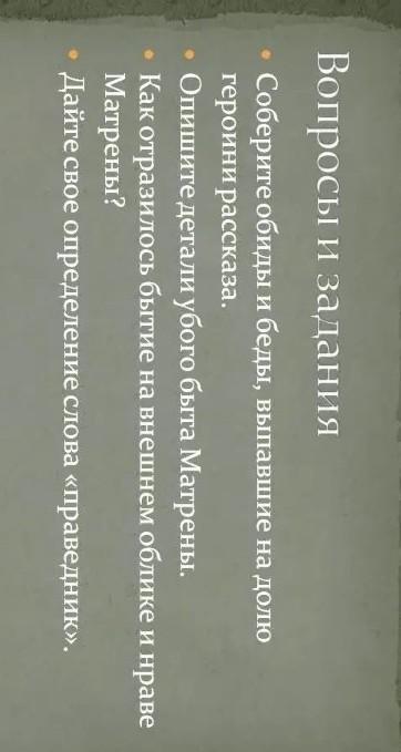 Тяжело живется Матрене, поскольку здоровье у нее очень слабое. «Она была больна, но не считалась инвалидом» . Четверть века - 25 лет - проработала Матрена в колхозе, причем честно трудилась. А теперь старая стала, больная и никому, соответственно она не нужна. Даже пенсии власти ей не начислили, хотя полагалась она ей по праву: муж ее пропал в начале войны.