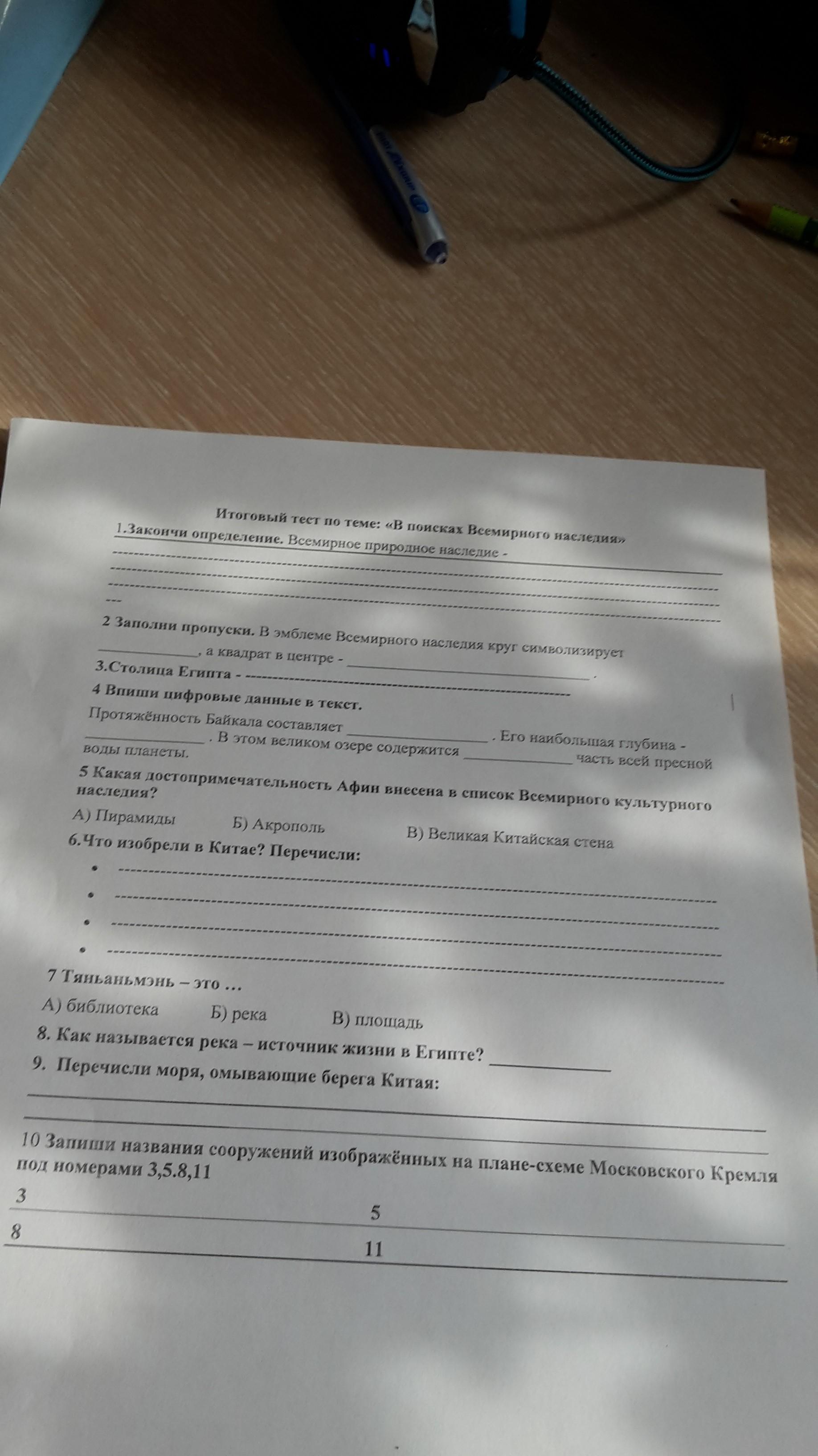 1. Закончи определение. Всемирное природное наследие - 2. Заполни пропуски. В эмблеме Всемирного наследия круг символизирует _____,а квадрат в центре - _____ 3. Что изобрели в Китае? Перечисли: ___________ ___________ ___________ ___________ 4. Запиши названия сооружений изображённых на плане схемы Московского Кремля под номерами 3,5,8,11