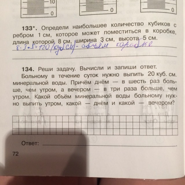 Больному в течение суток нужно выпить 20 куб.см воды.причем днём - в шесть раз больше, чем утром, а вечером - в три раза больше, чем утром. Какой объем воды больному нужно выпить утром, какой - днем и какой - вечером?