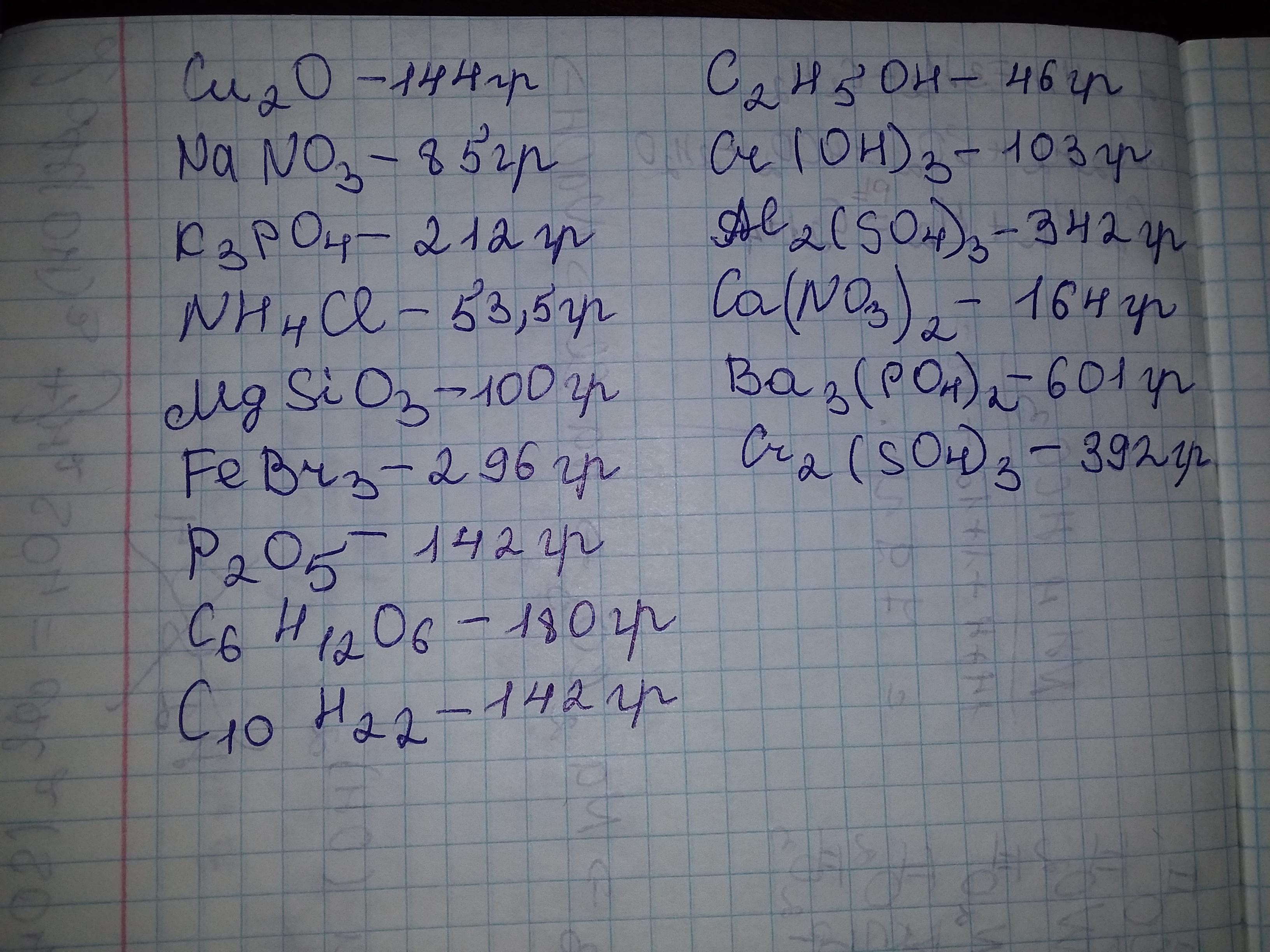 Сu2О, NaNO3,К3РО4, NH4Сl,МgSiO3,FеВr3, Р2О5, С6Н12О6,С10Н22,