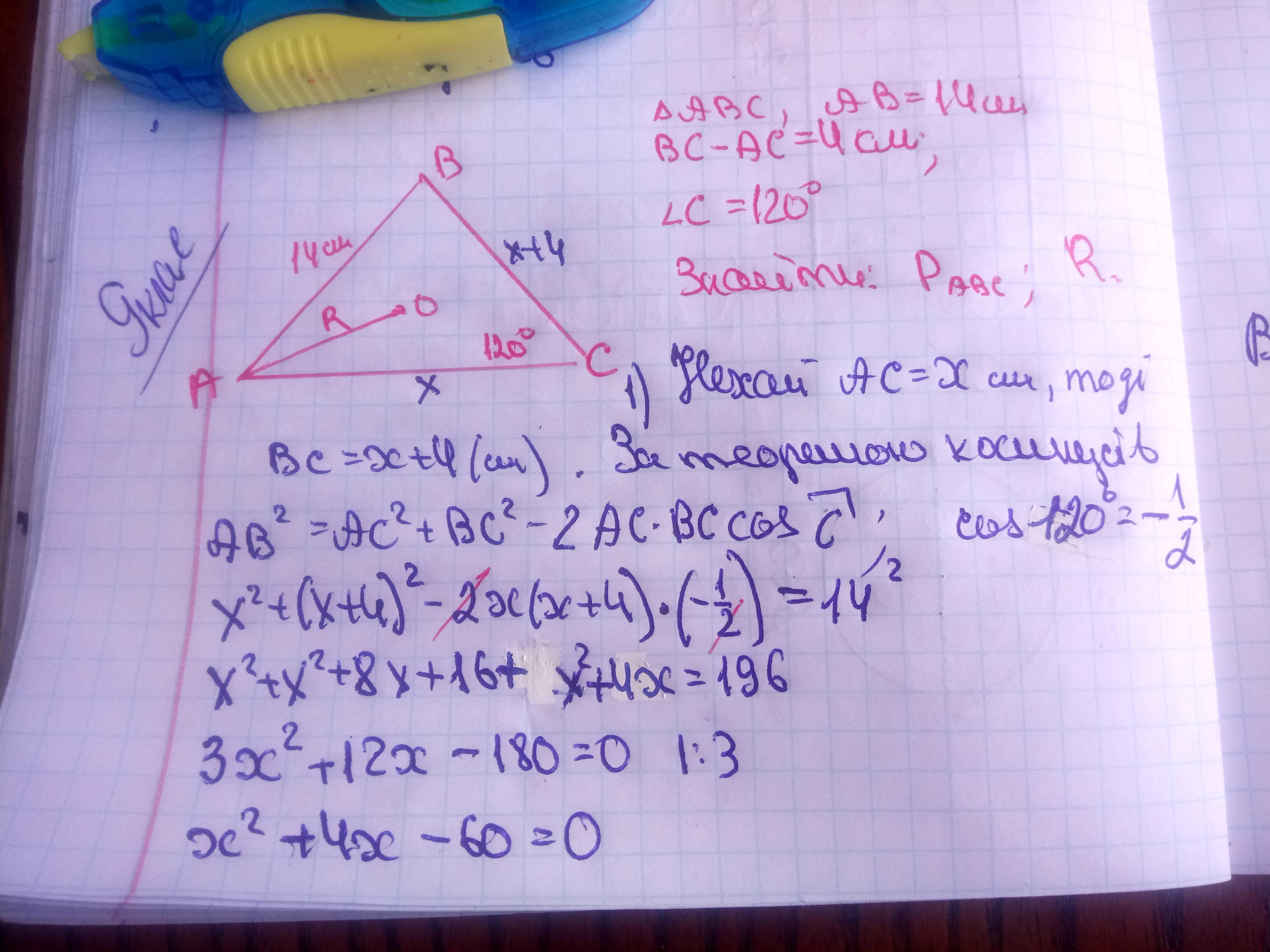 Дано: ∆ ABC; AB = 14 см; BC – AC = 4 см; ˂ С = 120 °. Знайти: P∆ABC;
