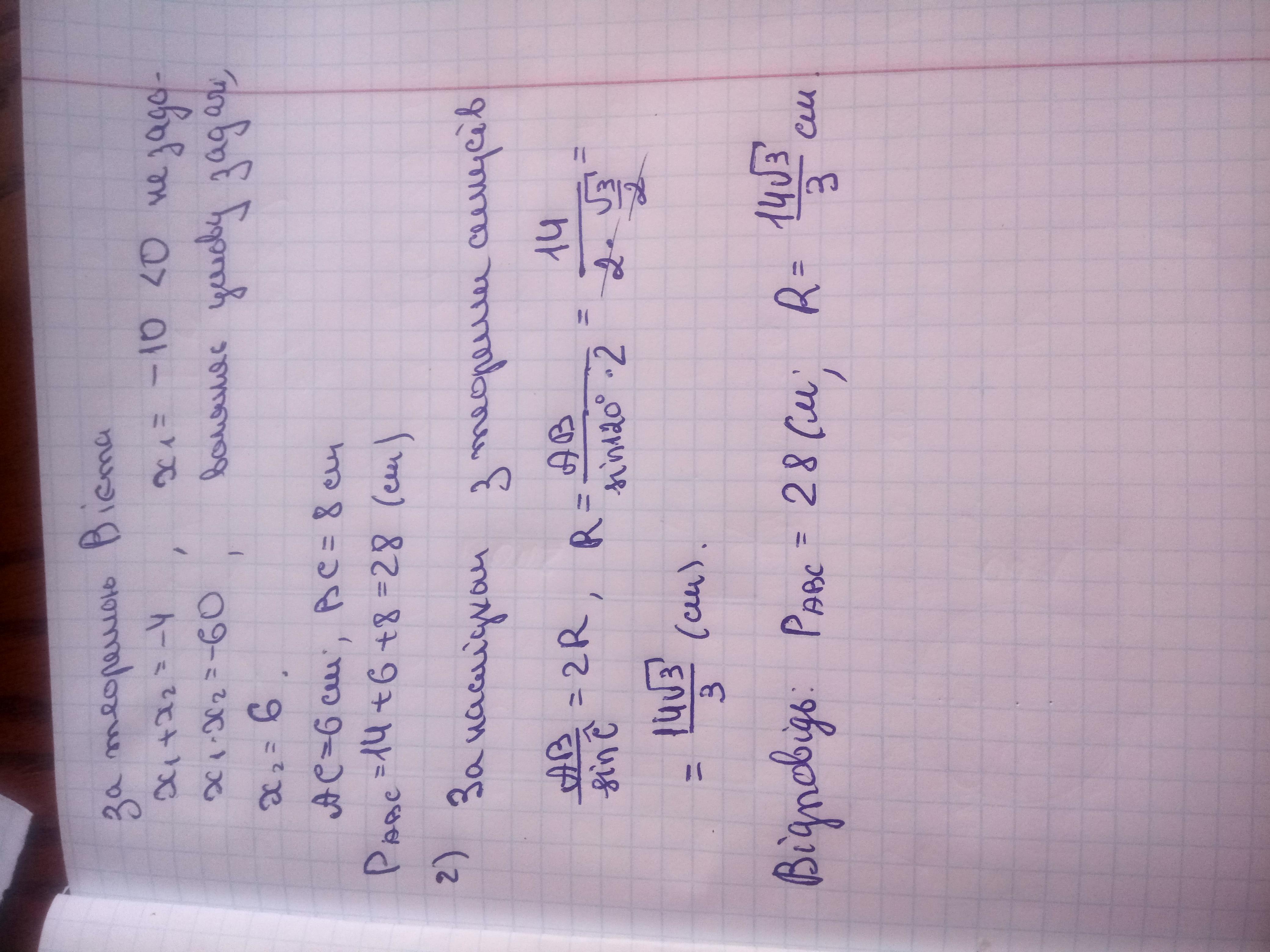 Відповідь: Р= 28 см, R=(14|/3)/3cм