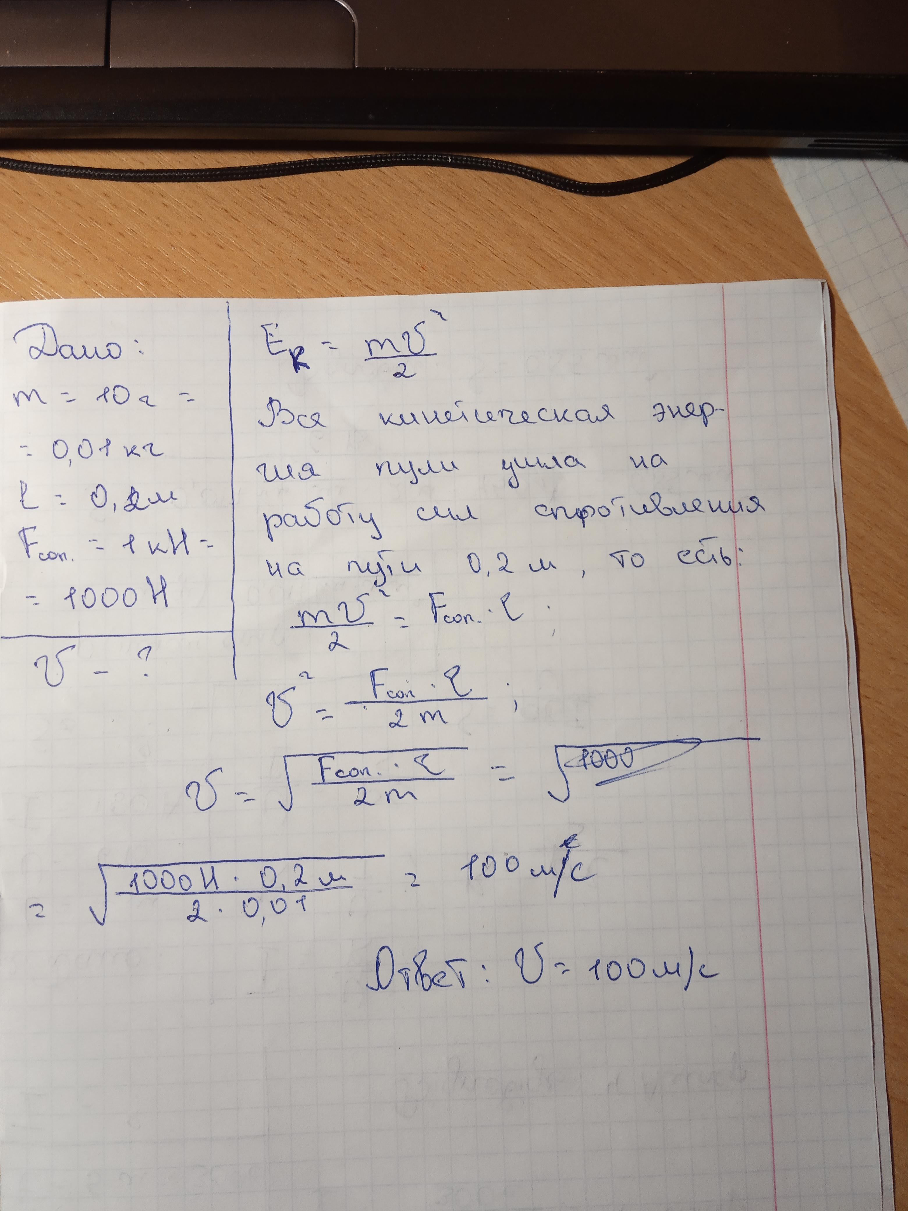 2.С какой скоростью должна лететь пуля массой 10 г, чтобы сделать отверстие в дереве