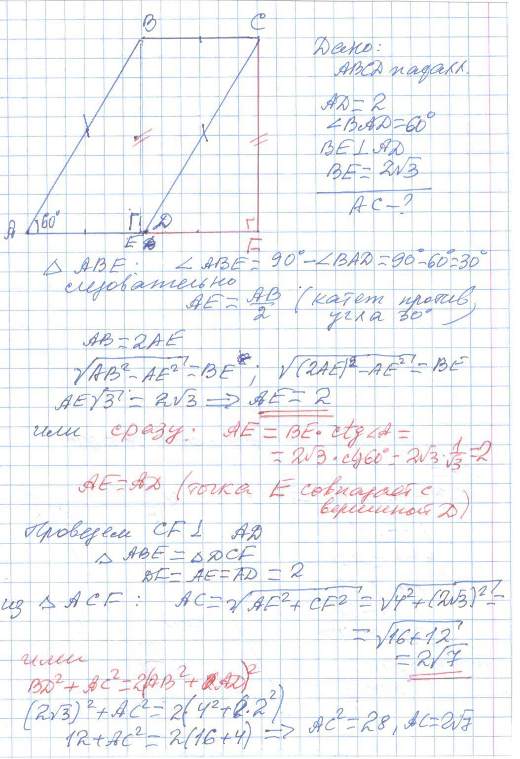 В параллелограмме ABCD дано: AD = 2, угол BAD = 60°, ВЕ и AD - перпендикулярны, ВЕ = 2√3. Найдите длину большей диагонали параллелограмма.