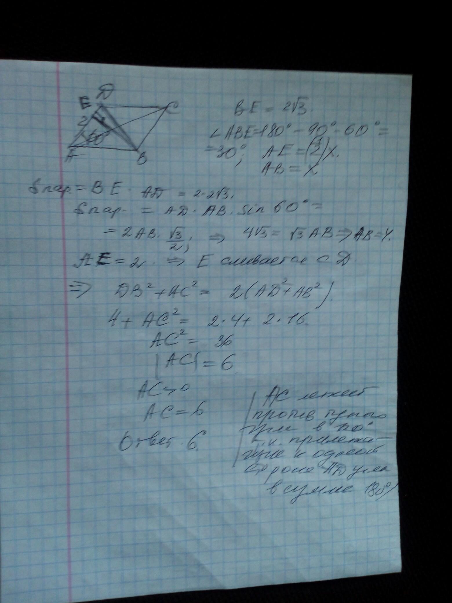 AE =BE*ctg(∠BAD) =2√3*ctg60° =2√3* 1/√3 = 2 = AD