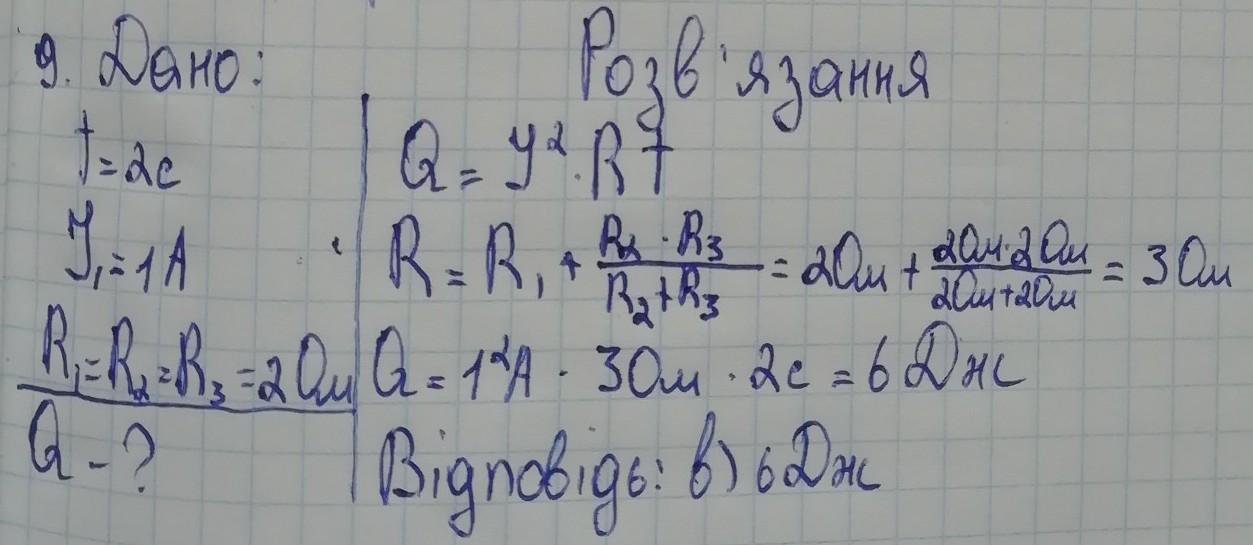 три резистори з'єднані послідовно скільки теплоти виділяється в колі за 2 с, якщо сила струму у першому резисторі 2А, а опір кожного резистора 5 Ом