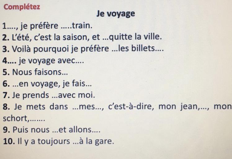 8) je mets dans ma valise mes vêtements d’été nécessaires, c´est-à-dire, mon jean, mon costume de sport,mon short, mes baskets, mes chaussettes