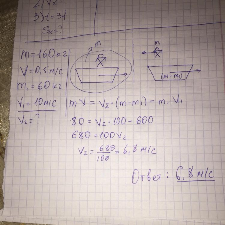 Срооочноооо!!!!! Даю 70 балов.Тележка с человеком общей массой 160 кг движется по горизонтальной поверхности по инерции со скоростью 0,5 м/с в тот момент, когда с неё соскакивает человек. Масса человека 60 кг, скорость прыжка 10 м/с. Прыжок состоялся в направлении, противоположном движению тележки. Какой будет скорость тележки?