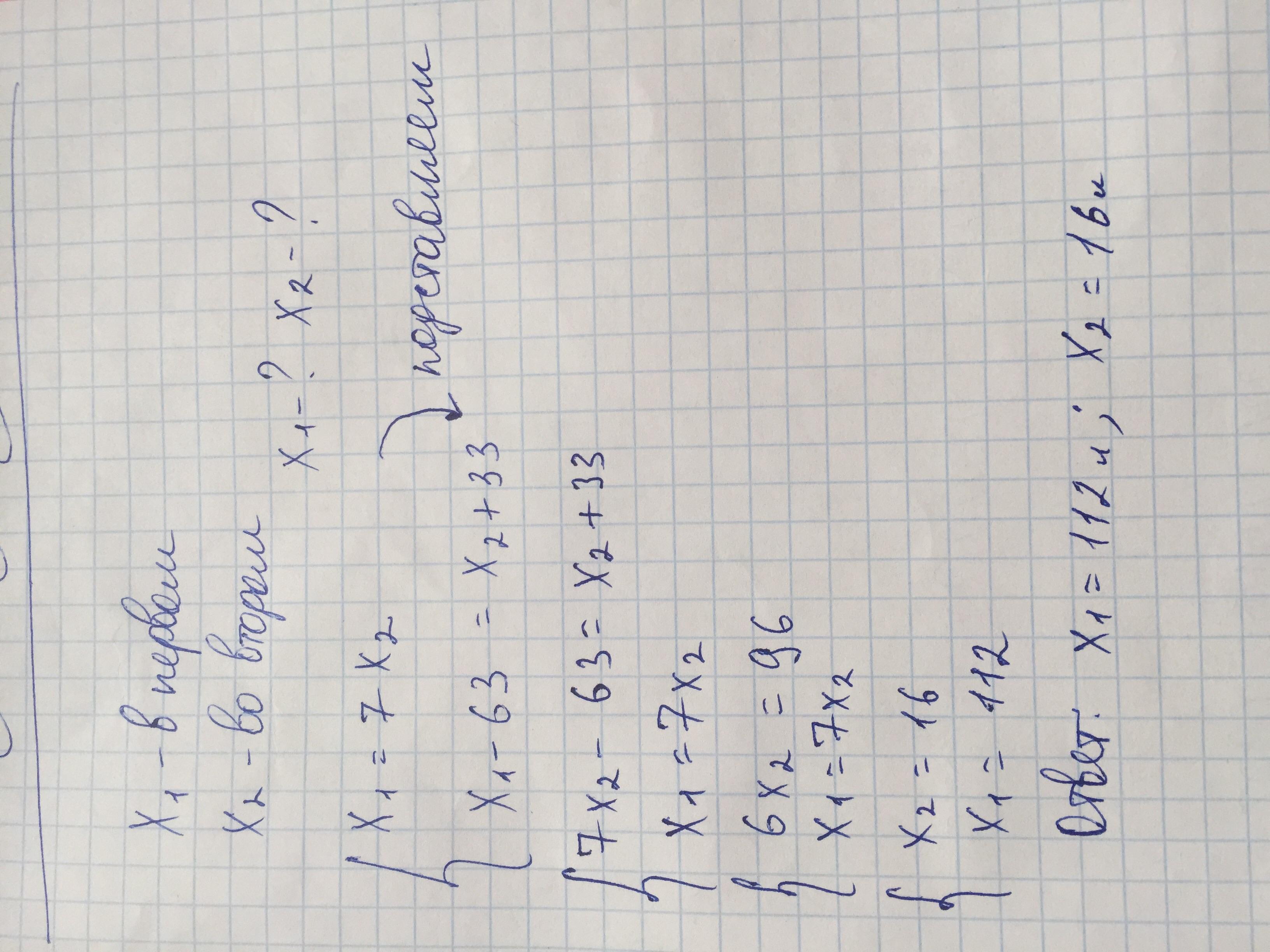 Решите задачу с помощью уравнения: В первом бидоне было в 7 раз больше молока, чем во втором. Когда из первого бидона отлили 63 л молока, а во второй долили еще 33 л, то в обоих бидонах молока стало поровну. Сколько литров молока было в каждом бидоне вначале?