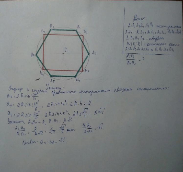 В окружность вписаны правильные четырехугольник и шестиугольник. Чему равно отношение сторон четырехугольника и шестиугольника?