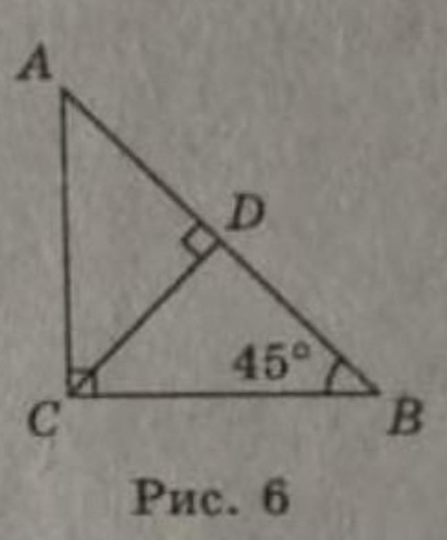 На рис. 6 у трикутнику ABC AC перпендикулярне CB, CD перпендикулярне AB, кут CBD =45° CD =10 см Знайдіть сторону AB.