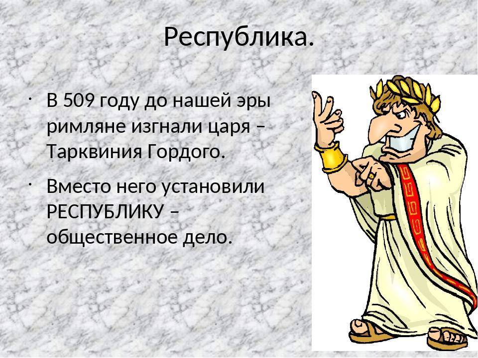509 (до н.э.) Изгнание царя Тарквиния Гордого и установление в Риме республиканского строя (во главе города — два выборных консула)